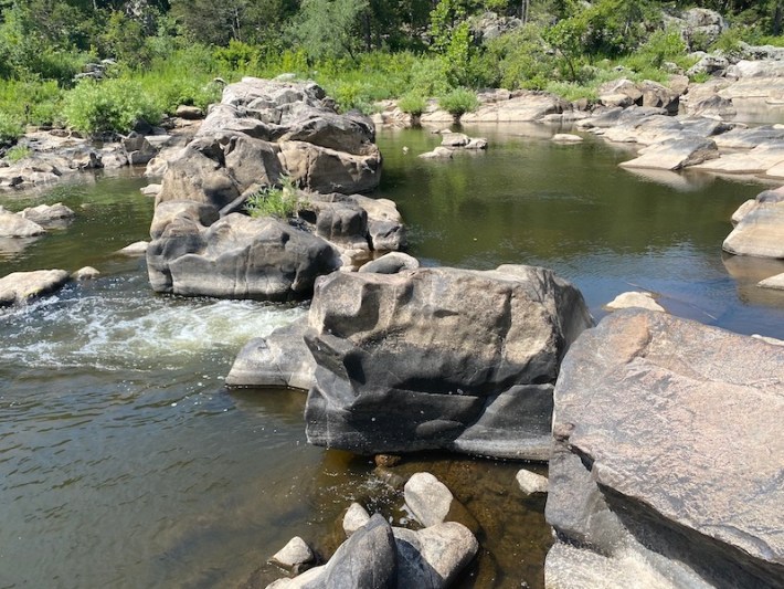 I instead headed directly down to the river to the Tiemann Shut-Ins below. This began the real adventure. I had bouldered through large rocks before at Johnson Shut-ins State Park so I was well-versed now of getting around. The water level here was low so I could easily stay out of it.